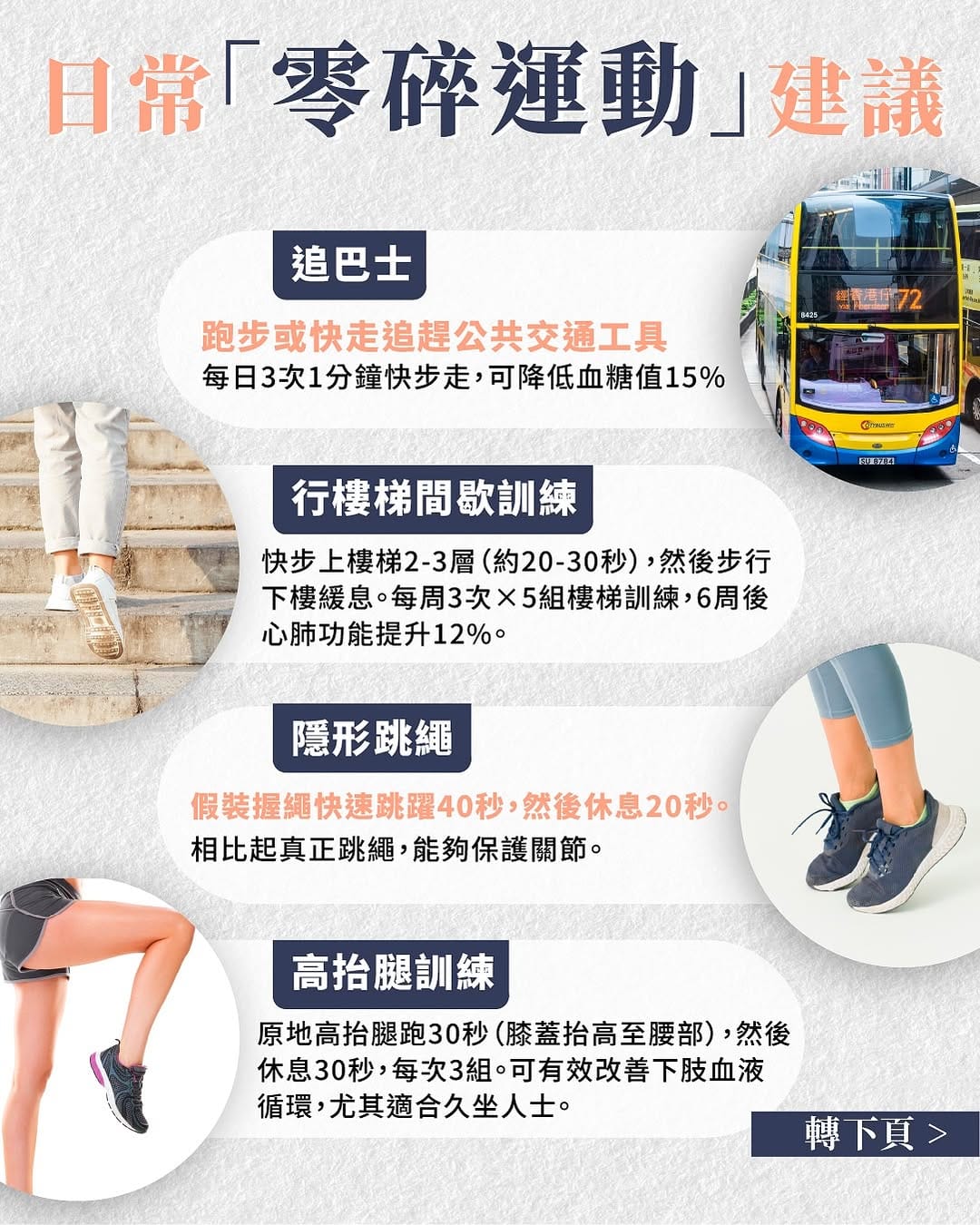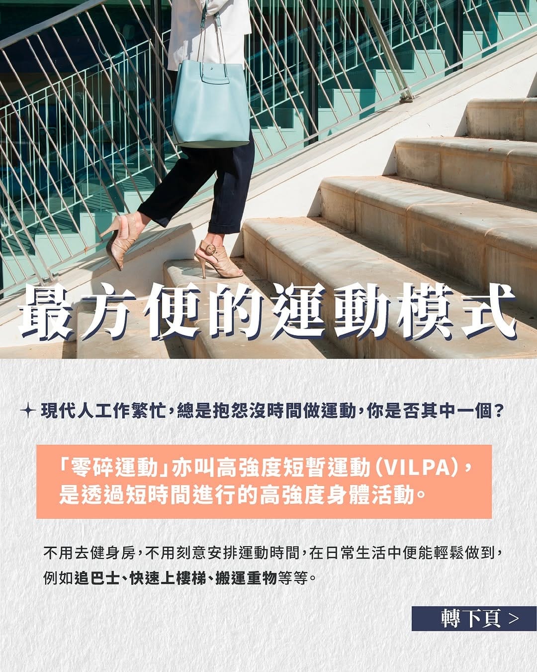 「零碎運動」亦叫高強度短暫運動(VILPA),是透過短時間進行的高強度身體活動。這種運動模式不用去健身房,不用刻意安排運動時間,在日常生活中便能輕鬆做到,例如追巴士、快速上樓梯、搬運重物等等。