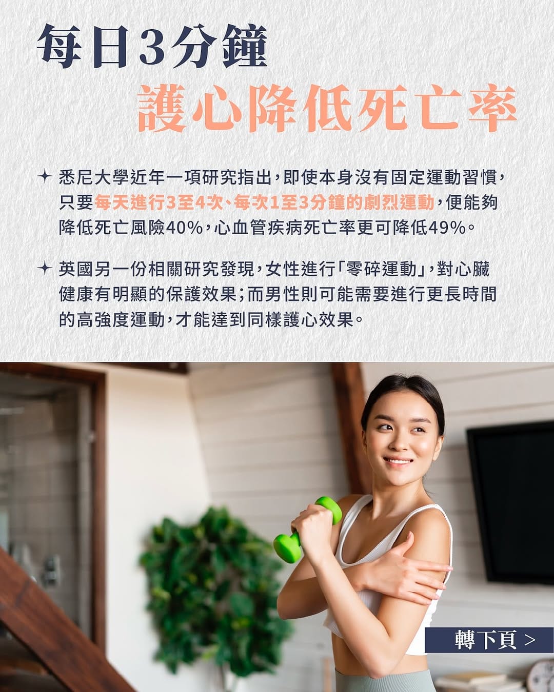 悉尼大學近年一項研究指出,即使本身沒有固定運動習慣,只要每天進行3至4次、每次1至3分鐘的劇烈運動,便能夠降低死亡風險40%,心血管疾病死亡率更可降低49%。