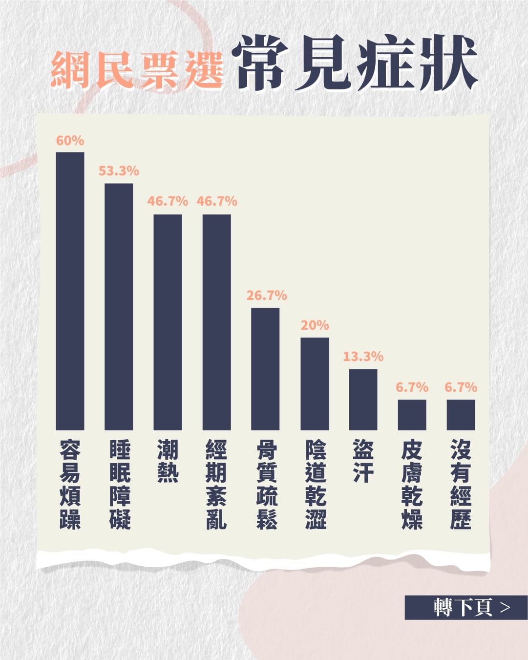 網民票選常見症狀調查顯示,容易煩躁位居首位,佔60%。其次是睡眠障礙,佔53.3%。潮熱和經期素亂各佔46.7%。