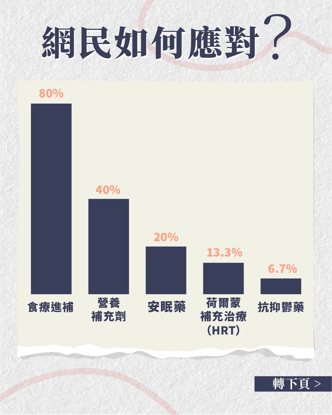 採用荷爾蒙補充治療(HRT)的比例為13.3%,使用抗抑鬱藥的只有6.7%,顯示大眾對醫療介入的接受程度偏低。