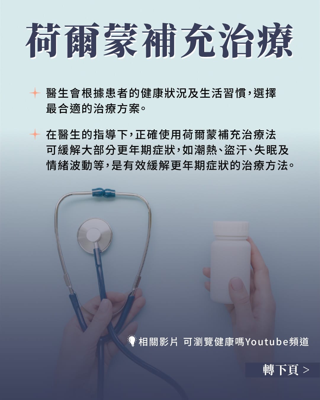 醫生會根據患者的健康狀況及生活習慣,選擇最合適的治療方案。在醫生的指導下,正確使用荷爾蒙補充治療法可緩解大部分更年期症狀,如潮熱、盜汗、失眠及情緒波動等,是有效緩解更年期症狀的治療方法。