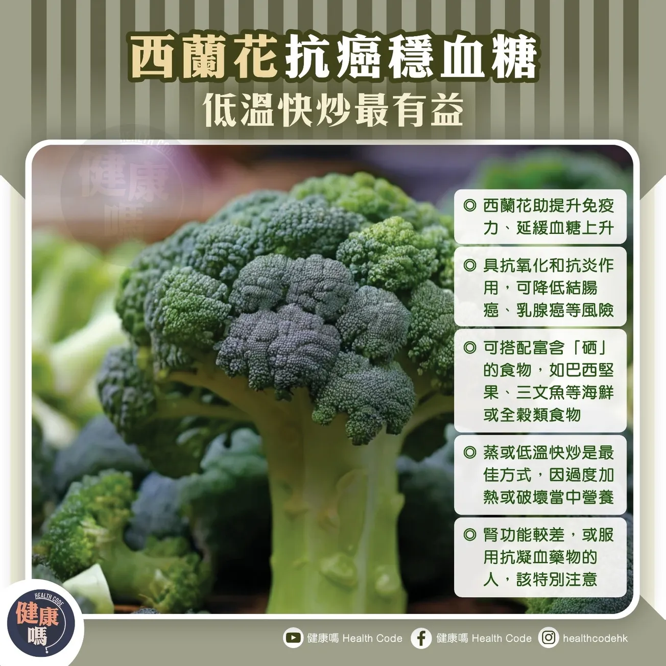 研究發現,西蘭花含對抗癌症的植物化合物,如異硫氰酸酯等,具抗氧化和抗炎作用,可對降低結腸癌、乳腺癌等風險,特別是對經常吃西蘭花的人,保護更為顯著。