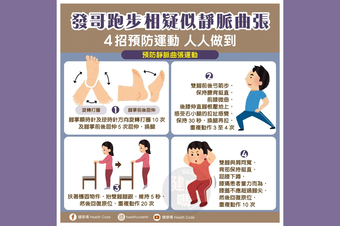 【留意身體變化】香港影帝周潤發熱愛跑步,偶爾會被市民「野生捕獲」,日前有網民在太平山巧遇後,把相片上載分享,有眼利網民發現發哥大腿出現兩個乒乓球般大小的腫塊,懷疑是嚴重的靜脈曲張。患有靜脈曲張的人士,應在醫生或專業醫療人員的指導下進行運動,因不同靜脈曲張病情的嚴重程度,適合的運動不一。