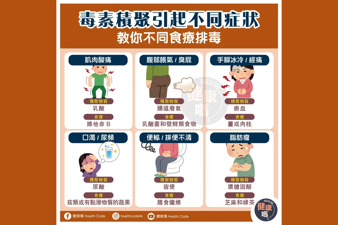 有很多人以為放屁就是排毒,但其實身體排毒主要是肝臟、腎臟、肺部、皮膚的工作,幫助身體清除有害物質。如果身體排毒功能不佳,身體長遠累積太多毒素,就會影響健康。想知道自己的排毒狀況,可留意以下的症狀,並看看身體是否積聚了太多廢物: