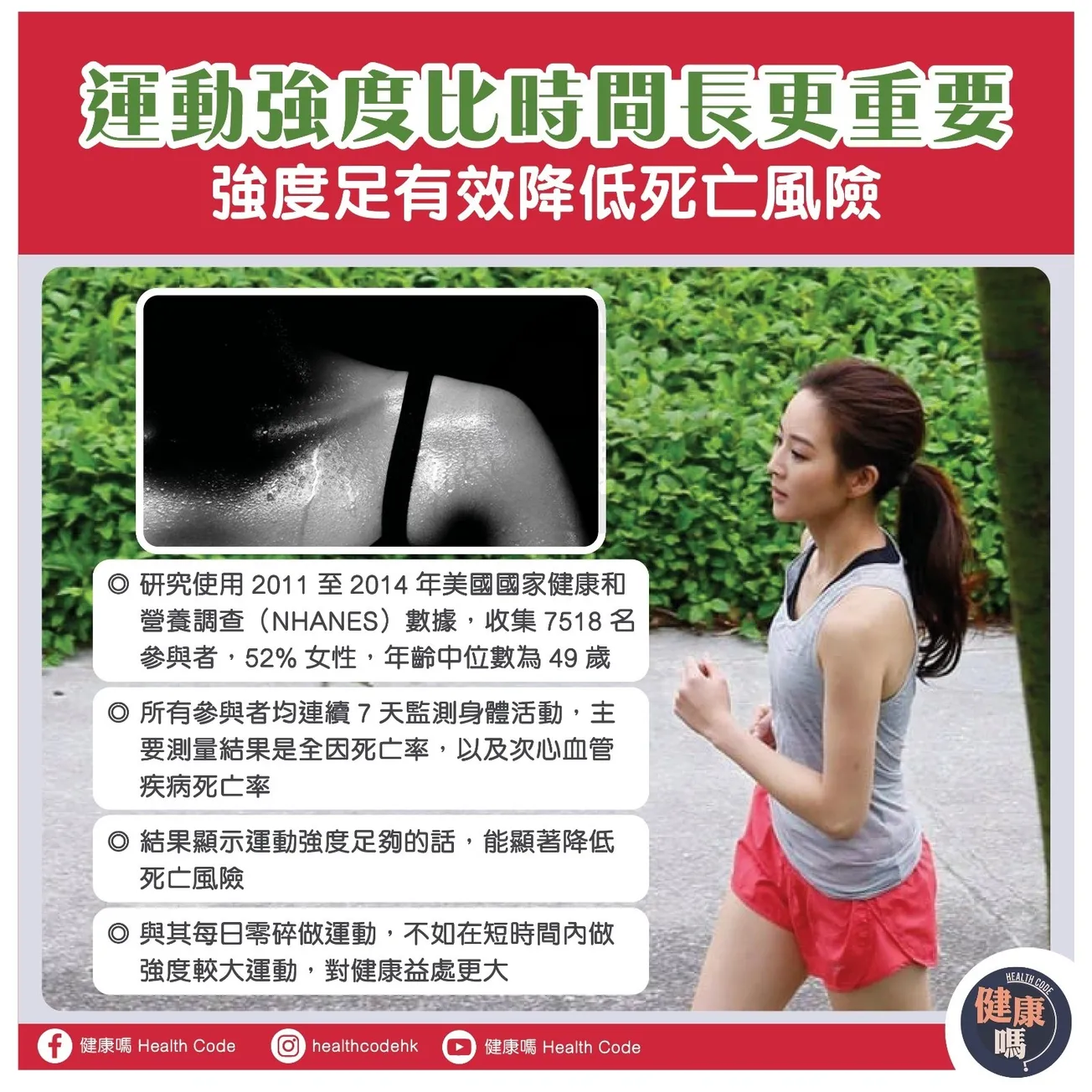 追蹤期間,共有718宗死亡事件。研究發現,不僅是做運動的時間,更重要的是運動的強度。