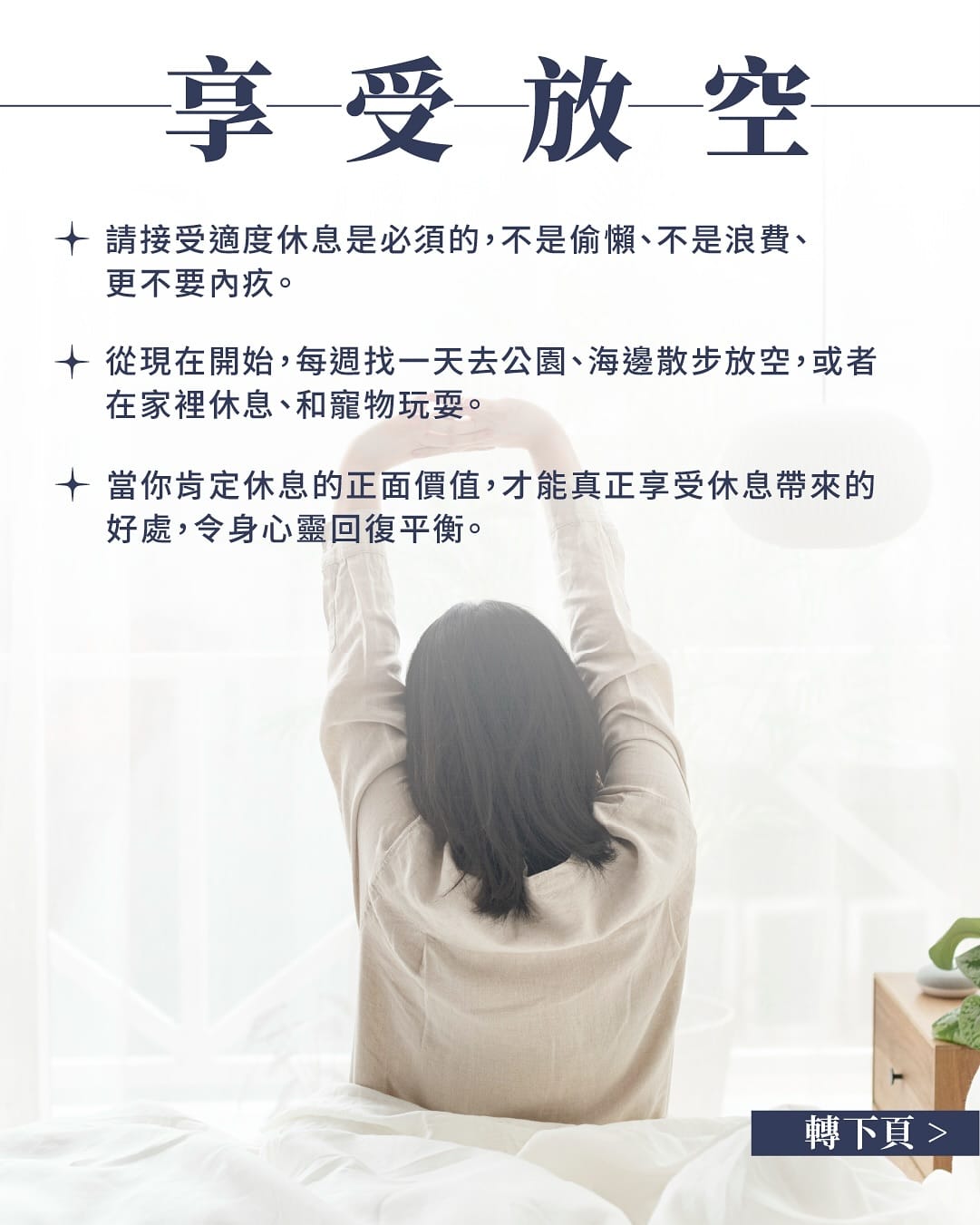 當你肯定休息的正面價值,才能真正享受休息帶來的好處,令身心靈回復平衡。從現在開始,每週找一天去公園、海邊散步放空,或者在家裡休息、和寵物玩耍。