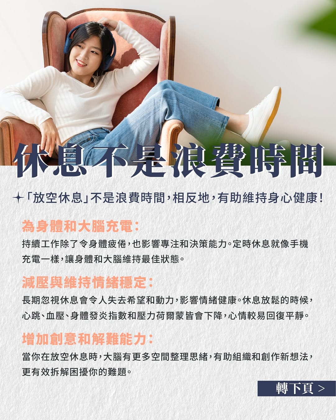 適度休息是必須的,不是偷懶、不是浪費、更不要內疚。「放空休息」不是浪費時間,相反地,有助維持身心健康。事實上,連假日都不放過自己的行為,長期可能導致身心失衡。