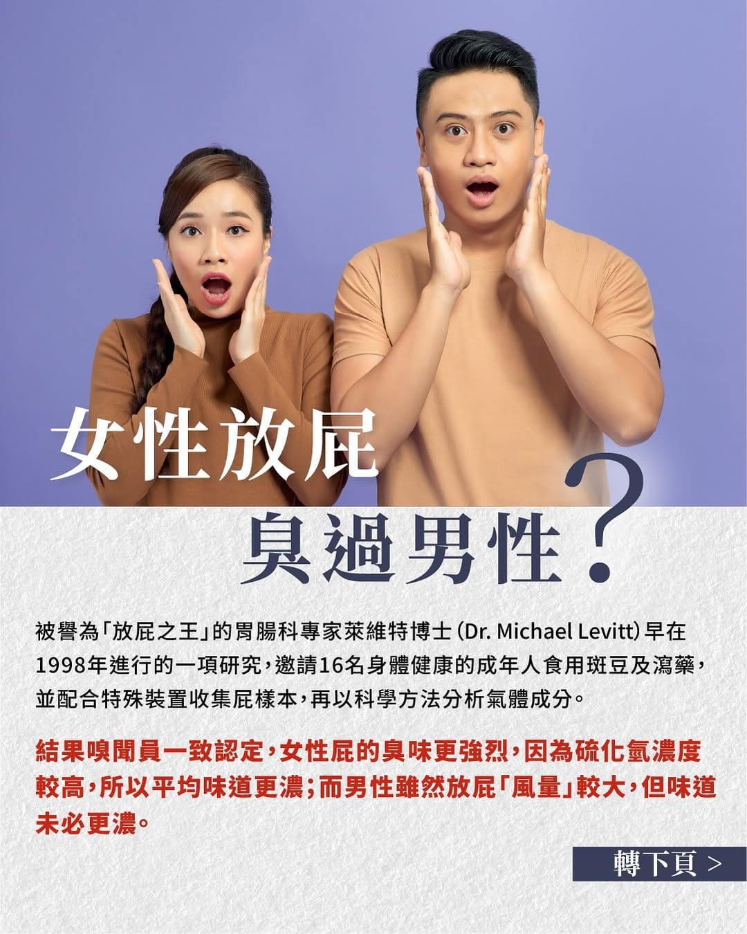結果呢喃員一致認定,女性屁的臭味更強烈,因為硫化氣濃度較高,所以平均味道更濃;而男性雖然放屁「風量」較大,但味道未必更濃。