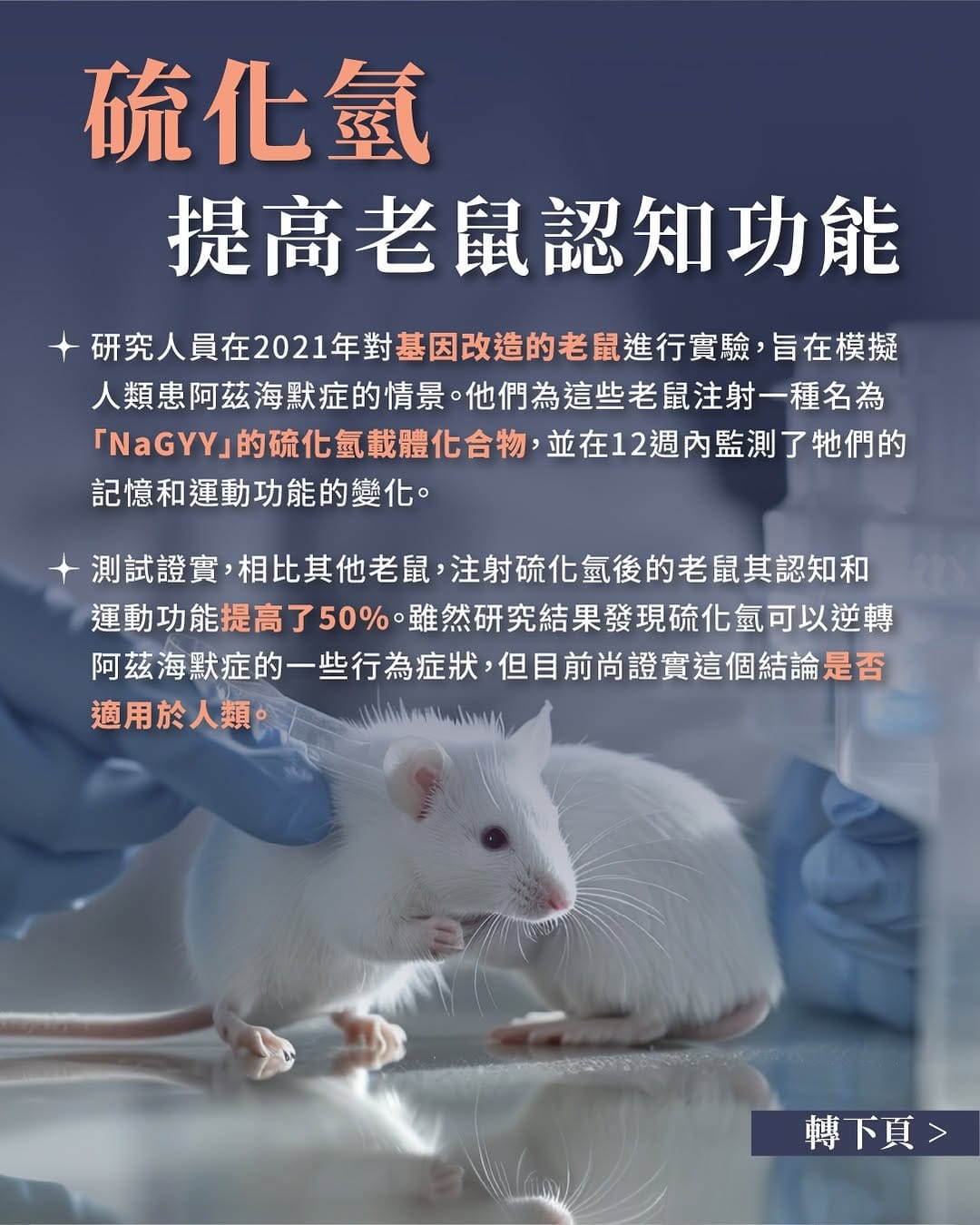 研究人員在2021年對基因改造的老鼠進行實驗,旨在模擬人類患阿茲海默症的情景。他們為這些老鼠注射一種名為「NaGYY」的硫化氫載體化合物,並在12週內監測了牠們的記憶和運動功能的變化。
