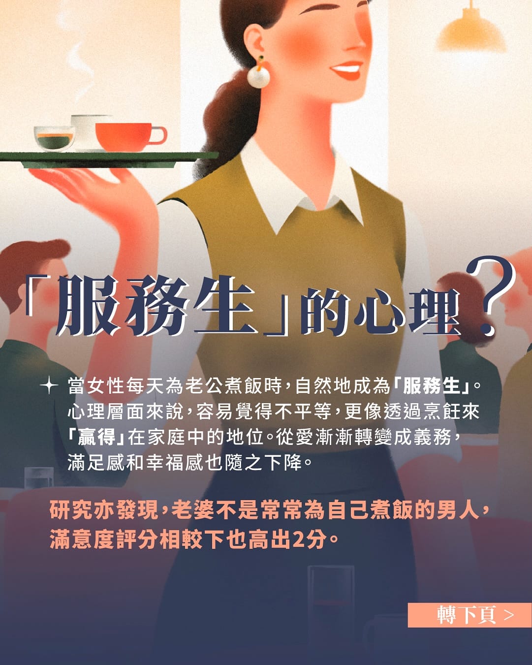哈佛大學研究人員追蹤了12,000對已婚夫婦,探討做家務與婚姻滿意度之間的關係。研究發現,當女性每天為老公煮飯時,容易產生「服務生」心態。